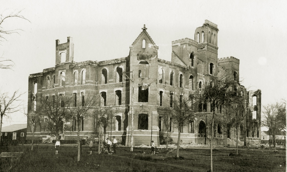 The charred remains of a four-story stone building, TCU's Waco campus main building after a fire