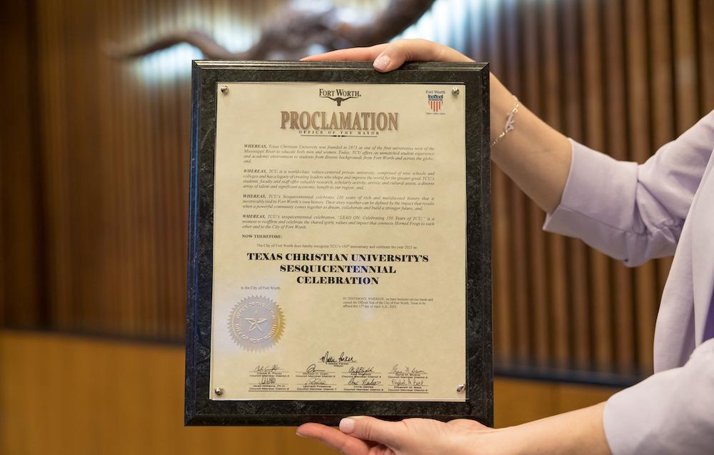 “Whereas, TCU’s Sesquicentennial celebration, ‘LEAD ON: Celebrating 150 Years of TCU,’ is a moment to reaffirm and celebrate the shared spirit, values and impact that connects Horned Frogs to each other and to the city of Fort Worth …” reads part of the proclamation.
